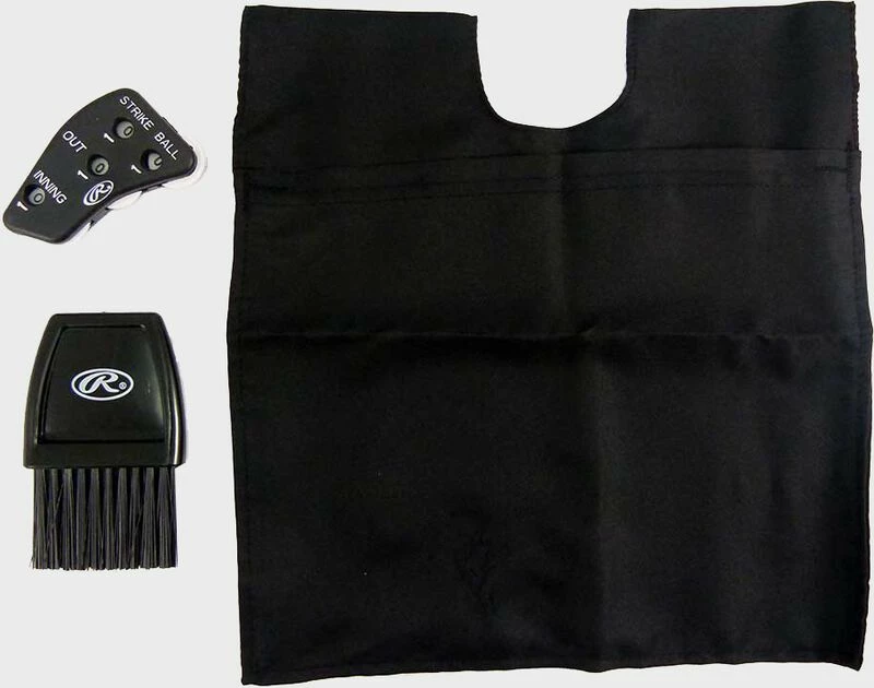 This umpire set includes a 4-dial indicator, a low-profile plate brush, and a black pro-style cloth bag.Â